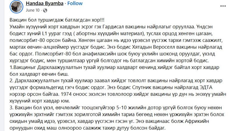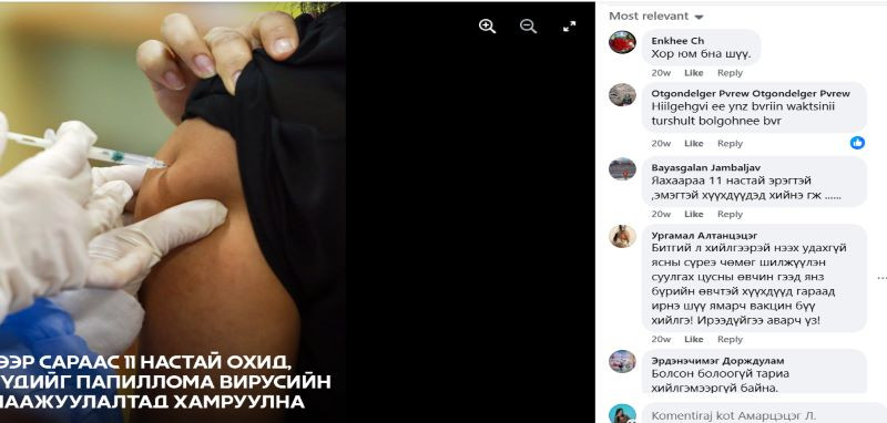 Вакцины эсрэг худал мэдээллийн уршгийг охид, бүсгүйчүүд АМИАРАА ТӨЛСӨӨР... Эмч нар болон зарим иргэн вакциныг бүх нийтэд тарьж, ашиг олох зорилго агуулж байна, вакцин таны генийг өөрчилнө, охидыг үргүйдэлд хүргэнэ, бидний бие дээр туршилт явуулж байна гэх мэтээр ул үндэсгүй, баталгаа нотолгоогүй, эх сурвалжгүй мэдээлэл түгээсээр байна.