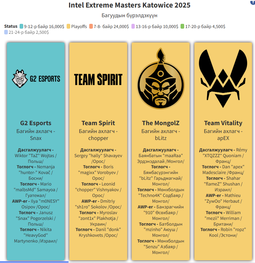 ESL-ээс жил бүр зохиодог CS2 (Counter Strike 2)-ын томоохон тэмцээнүүдийн нэг "Intel Extreme Masters Katowice 2025" Польшийн Катовиц хотод үргэлжилж байна.