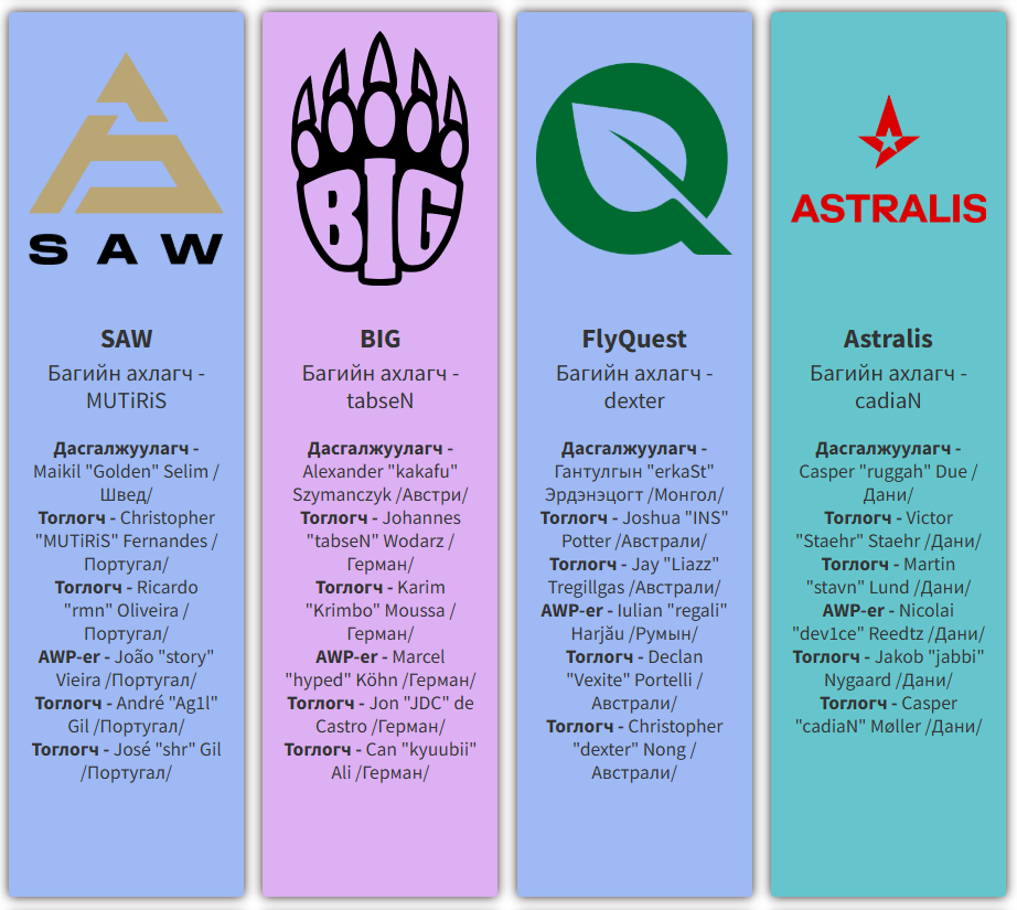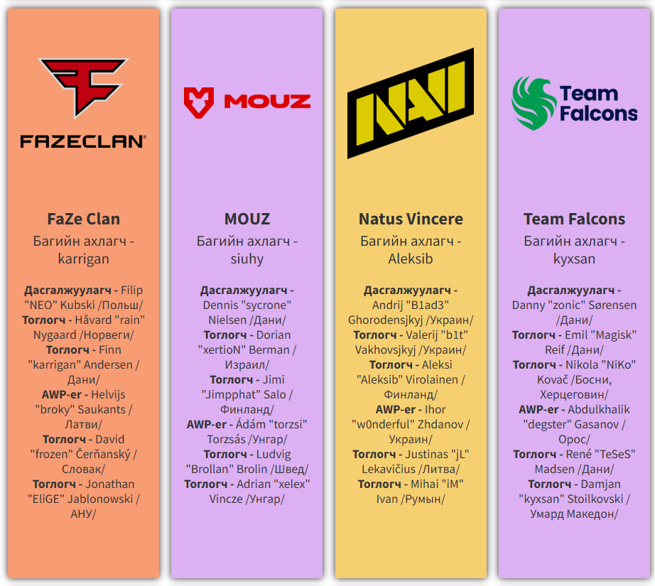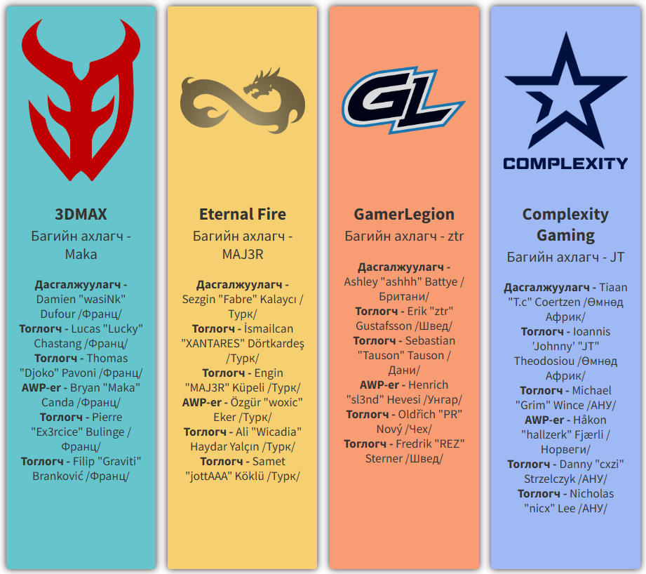 Ийнхүү playoffs-т шалгарсан шилдэг зургаан багийн нэг The MongolZ эхний тоглолтоо "А" хэсгийн гуравдугаар байраар шалгарсан Туркийн "Eternal Fire" багтай хийхээр болов. Eternal Fire баг хэсгийн шатанд "FaZe Clan", "3DMAX", "Team Falcons" зэрэг хүчирхэг багуудыг буулган авсан юм.