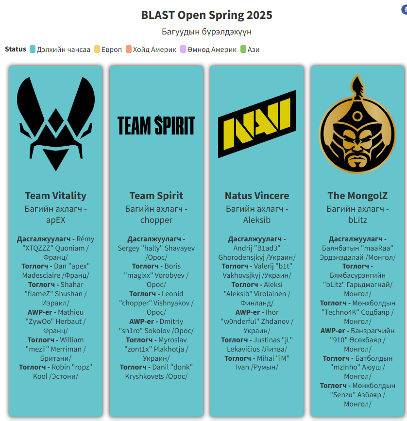 Азийн бүсийн сонгон шалгаруулалтын тэмцээн буюу "BLAST Rising Asia Spring 2025"-д Монголын гурав, Хятадын тав, Австралийн нэг нийт найман баг тоглосон. ATOX Esports-ын хувьд Австралийн "Rooster", Хятадын "Rare Atom" зэрэг багуудыг хожиж финалд нутаг нэгт "The Huns Esports" багийг буулган авсан.