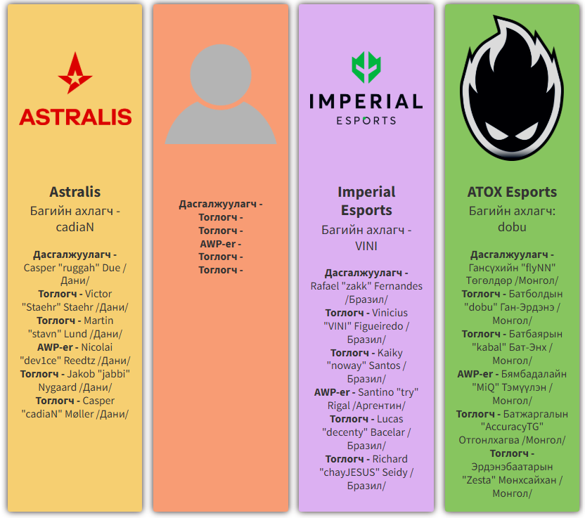 Харин үлдсэн дөрвөн багийг Ази, Хойд Америк, Өмнөд Америк, Европын бүсээс сонгон шалгаруулсан юм. Улмаар Азийн бүсээс Монголын "ATOX Esports" баг эрхээ авч чадлаа.