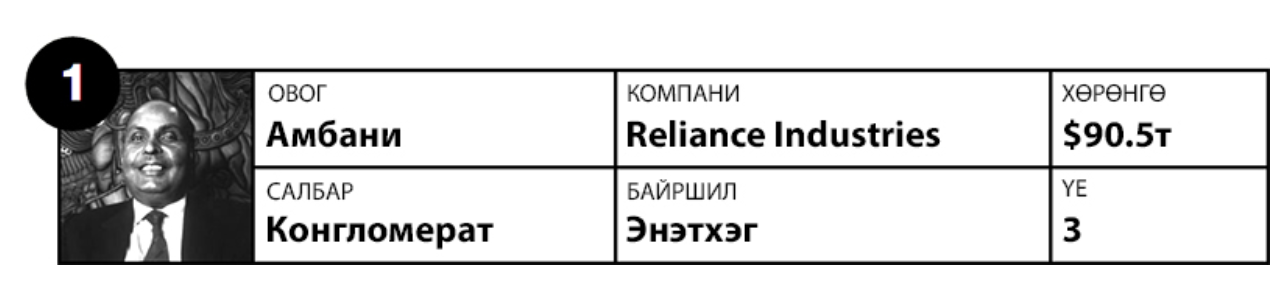 Эрэмбийн тэргүүнд Энэтхэгийн аварга конгломерат "Reliance Industries"-ийг удирддаг Амбанигийн гэр бүл 90.5 тэрбум ам.долларын хөрөнгөтэйгөөр бичигдэж байна. Ингээд Азийн хамгийн чинээлэг гэр бүлүүдийн эрэмбийн эхний 10 байрт орсон гэр бүлүүдтэй танилцацгаая.