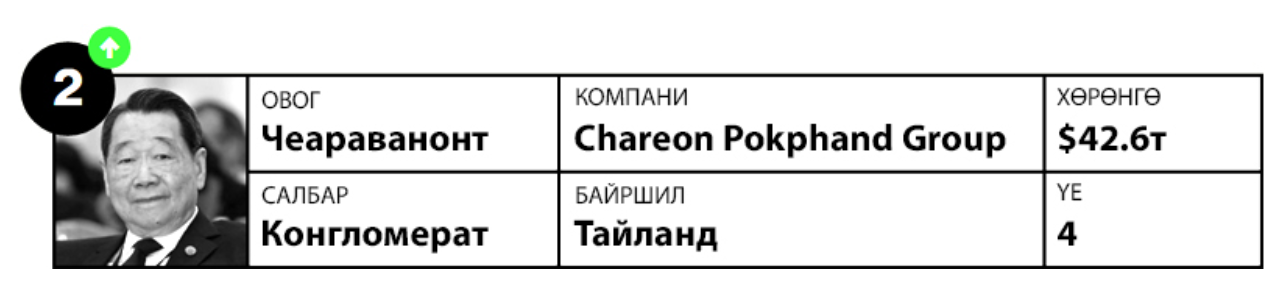 Чиа Эк Чор 1921 онд хар салхины улмаас сүйдсэн Өмнөд Хятад дахь тосгоноо орхин Тайландад шинэ амьдрал эхлүүлж, ахынхаа хамт хүнсний ногооны үр зардаг болжээ. Үүнээс нэгэн зууны дараа Чиагийн хүү Данин Чеараванонт хүнс, жижиглэн худалдаа, харилцаа холбооны салбарт конгломерат болсон "Charoen Pokphand Group"-ийн ТУЗ-ийн захирлаар ажиллаж байна.