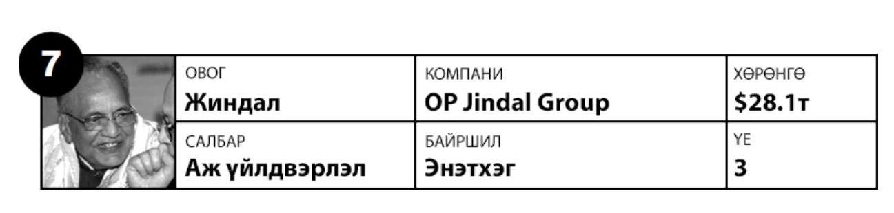 1952 онд гангийн үйлдвэрээс бизнесийн гараагаа эхлүүлсэн Ом Пракаш Жиндал компаниа эрчим хүч, цемент, спорт зэрэг олон салбарыг хамарсан "OP Jindal Group" конгломерат болгон өргөжүүлж чадсан. 2005 онд нисдэг тэрэгний ослоор нас барахаасаа өмнө тэрбээр Энэтхэгийн хойд хэсгийн Харьяна мужид эрчим хүчний сайдаар ажилладаг байсан юм. Түүний эхнэр Савитри компанийн ТУЗ-ийн дарга болж, дөрвөн хүү нь бизнесийн үйл ажиллагааг удирдаж байна.