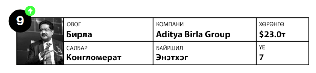 "Aditya Birla Group" нь Энэтхэгийн хамгийн урт удаан түүхтэй гэр бүлийн бизнесүүдийн нэг юм. Хөвөнгийн арилжааны чиглэлээр XIX зуунд үүсгэн байгуулагдаж байсан тус компани өдгөө металл, санхүүгийн үйлчилгээ болон жижиглэн худалдааны чиглэлд үйл ажиллагаа явуулж байна. Их Британийн эрхшээлээс Энэтхэгийг чөлөөлөх Махатма Гандигийн хөдөлгөөний гол санхүүжүүлэгчдийн нэг байсан Ганшям Дас Бирла тус группийг байгуулж, өдгөө Энэтхэгийн хөнгөн цагааны хамгийн том үйлдвэрлэгчдийн нэг болох суурийг нь тавьсан байна. Өдгөө түүний гуч хүү Кумар Мангалам Бирла группийн ТУЗ-ийн даргаар ажиллаж байна.