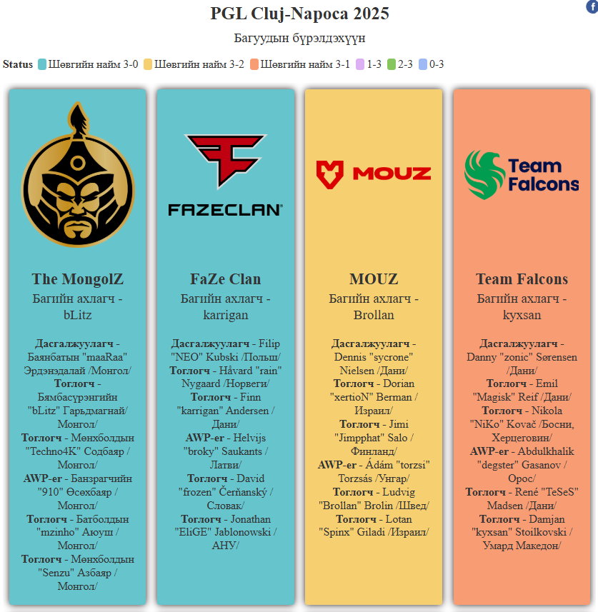 The MongolZ "PGL Cluj-Napoca 2025" тэмцээний шөвгийн наймд, өнөөдөр 19:00 цагаас Каспер "cadiaN" Моллер ахлагчтай Данийн "Astralis" багтай тоглоно.