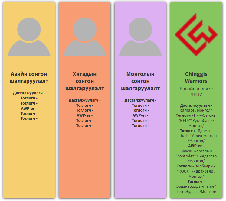 "carnage" дасгалжуулагчтай Chinggis Warriors хоёр долоо хоногийн өмнө "PGL Bucharest 2025" тэмцээний эрх олгох "MESA Asian Masters 2025" тэмцээнд Хятадын "Rare Atom" багт хожигдон 3-р байр эзлээд байв.