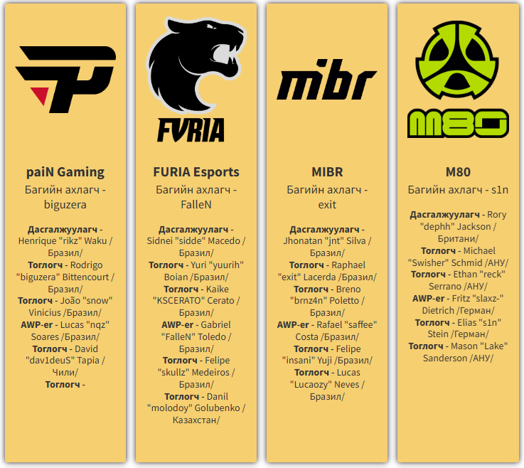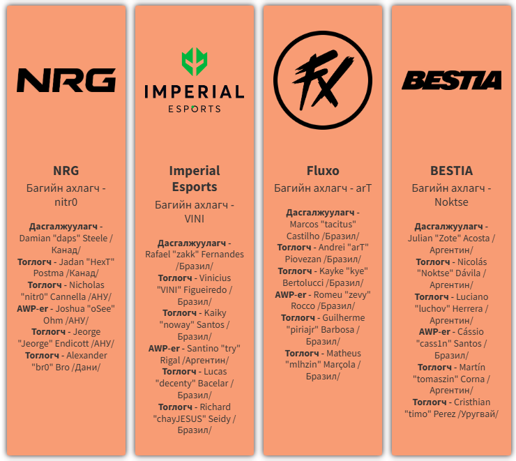 Багийн ахлагч Бямбасүрэнгийн "bLitz" Гарьдмагнай болон Мөнхболдын "Techno4K" Содбаяр нар зургаа дахь удаа sticker-тэй болох гэж байна. Тэд анх хамтдаа "IHC Esports" багт байхдаа "PGL Major Antwerp 2022" тэмцээнд оролцож байсан ба тухайн жилдээ "Intel Extreme Masters Rio Major 2022"-т оролцож наалтууд гаргасан.
