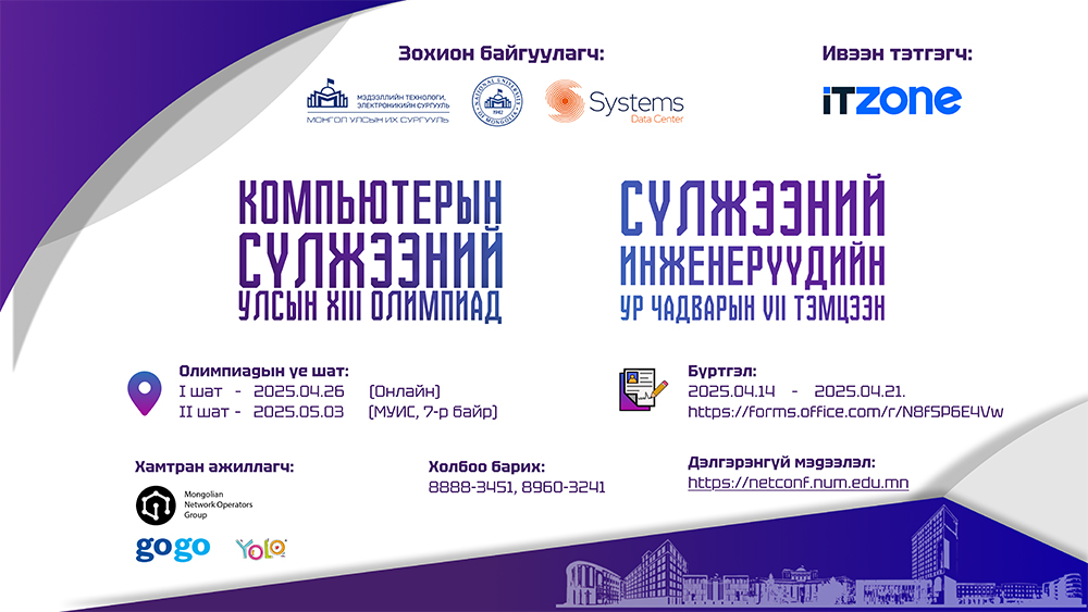 Энэ жилийн "Компьютерын сүлжээний улсын XIII олимпиад", "Сүлжээний инженерүүдийн ур чадварын VII тэмцээн"-ийг 5-р сарын 3-ний өдөр Эс системс" дата төв болон MNNOG ТББ -тай хамтран зохион байгуулахаар ажиллаж байна.