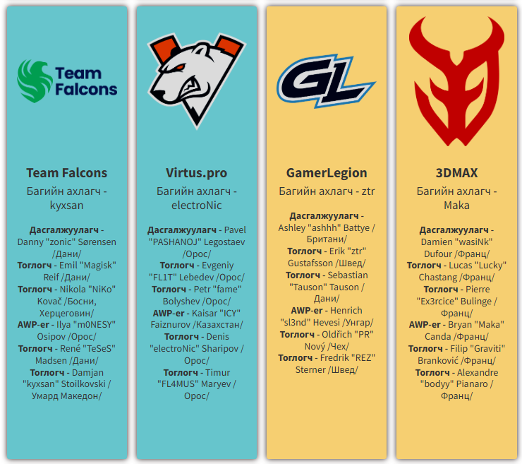 Энэ удаагийн тэмцээнд дэлхийн чансаанд дээгүүр байр эзэлж буй "G2", "Spirit", "Aurora" багууд оролцоогүй.