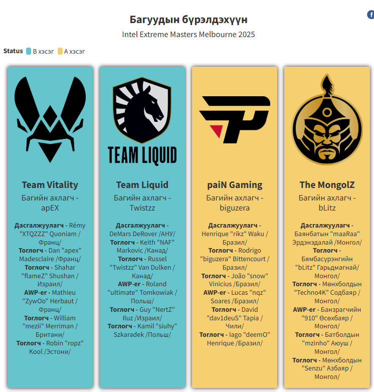 Жилд таван удаа болдог "ESL Grand Slam" цувралын оны хоёр дахь тэмцээн $1,000,000 (3.5 тэрбум төгрөг) шагналын сантай "Intel Extreme Masters Melbourne 2025" Австралийн Мельбурн хотод үргэлжилж байна.