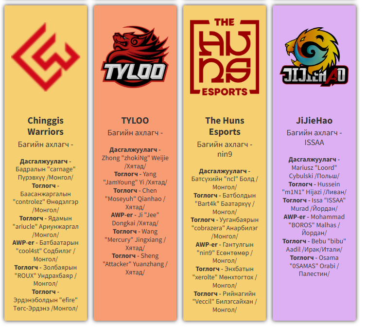 Мөн major-т Хятадыг төлөөлөх "TYLOO", Монголыг төлөөлөх "Chinggis Warriors" багууд тэдэнтэй өрсөлдөнө.