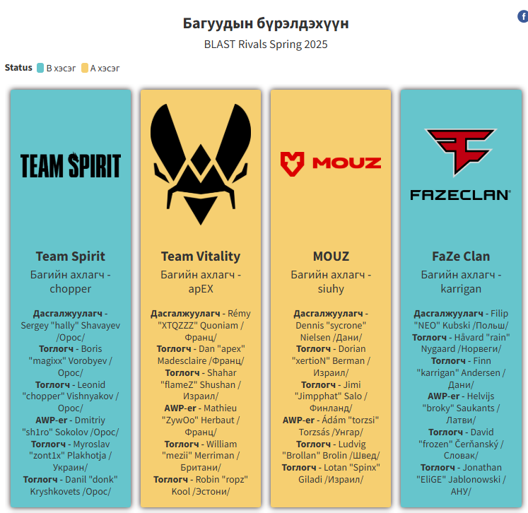 BLAST-аас зохиож буй CS2-ын $350,000 (1.2 тэрбум төгрөг) шагналын сантай "BLAST Rivals Spring 2025" тэмцээн өнөөдөр Данийн Копенхаген хотод эхэлнэ.