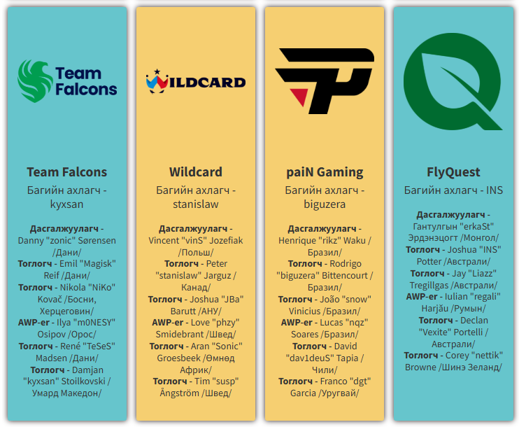 Найман баг хоёр хэсэгт хуваагдан өрсөлдөх тэмцээнд Гантулгын "erkaSt" Эрдэнэцогтоор удирдуулсан Австралийн "FlyQuest" баг оролцоно.