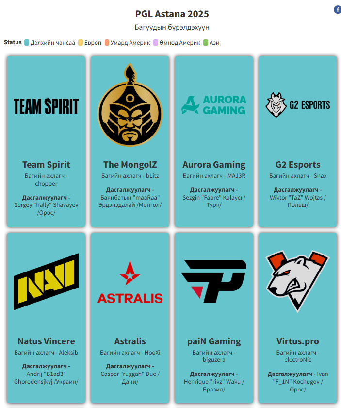 PGL-ээс зохиож буй $1,250,000 шагналын сантай "PGL Astana 2025" тэмцээн тавдугаар сарын 10-18-ны хооронд болно. Шилдэг 16 баг өрсөлдөх тэмцээнд Монголын "The MongolZ" баг оролцоно.