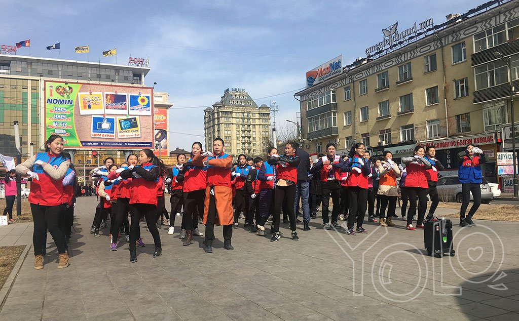 Баянзүрх Өсвөрийн Улаанзагалмайн гишүүд өнөөдөр Газар хөдлөлтийн гамшгийн аюулаас урьдчилан сэргийлэх, таниулах өдөрт зориулан флаш моб бүжлээ.