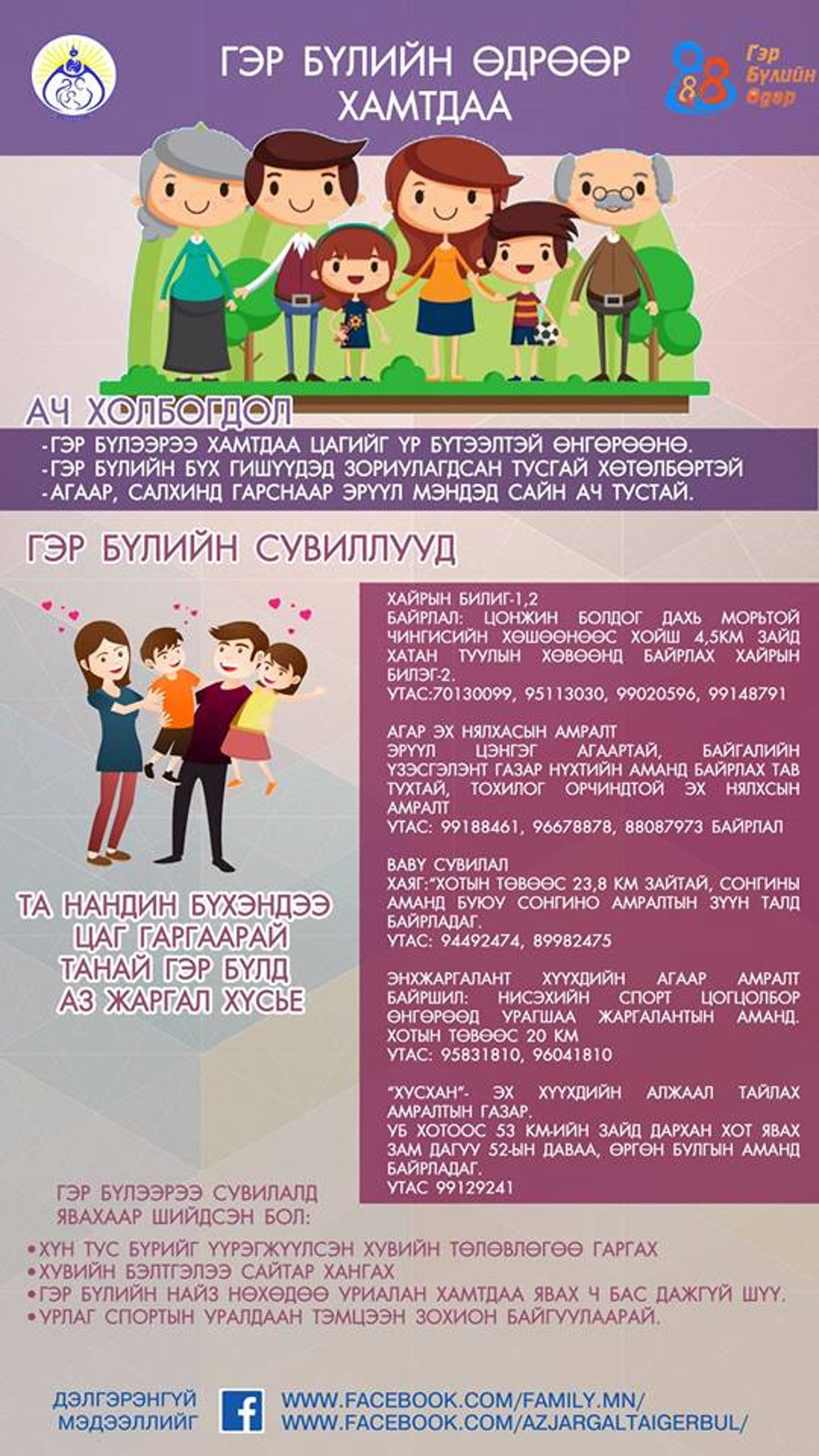 Гэр бүлийн өдрөөр юу хийж өнгөрүүлэх, хэрхэн тэмдэглэхээ мэдэхгүй байгаа, нийслэлд гэр бүлд чиглэсэн хөнгөлөлт урамшуулал хаана байгаа, гэр бүлээрээ очихыг хүссэн газар байгаа боловч хаяг байршил, урамшууллыг мэдэхгүй байгаа хүмүүс ЭНД дарж мэдээлэл аваарай гэж Нийслэлийн хүүхэд гэр бүлийн хөгжлийн газраас мэдээллээ.