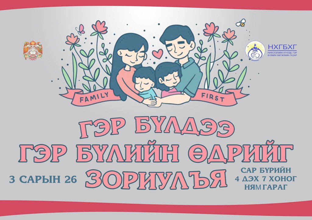Энэ сарын сүүлийн долоо хоногийн Ням гариг буюу 3-р сарын 26-нд тохиох гэр бүлийн өдрийг “Уулзах газар танайд” уриан доор тэмдэглэж байна. Энэхүү гэр бүлийн өдрөөр гэр бүлээрээ хамтдаа кино үзэх, номын сан очих, амралт сувилалд явах, гэр бүлээрээ хурал хийх, спортоор хичээллэх, музейгээр зочлох, гэх мэт олон сонирхолтой зүйлсийг хийж нэг өдрийг гэр бүлдээ зориулаарай.