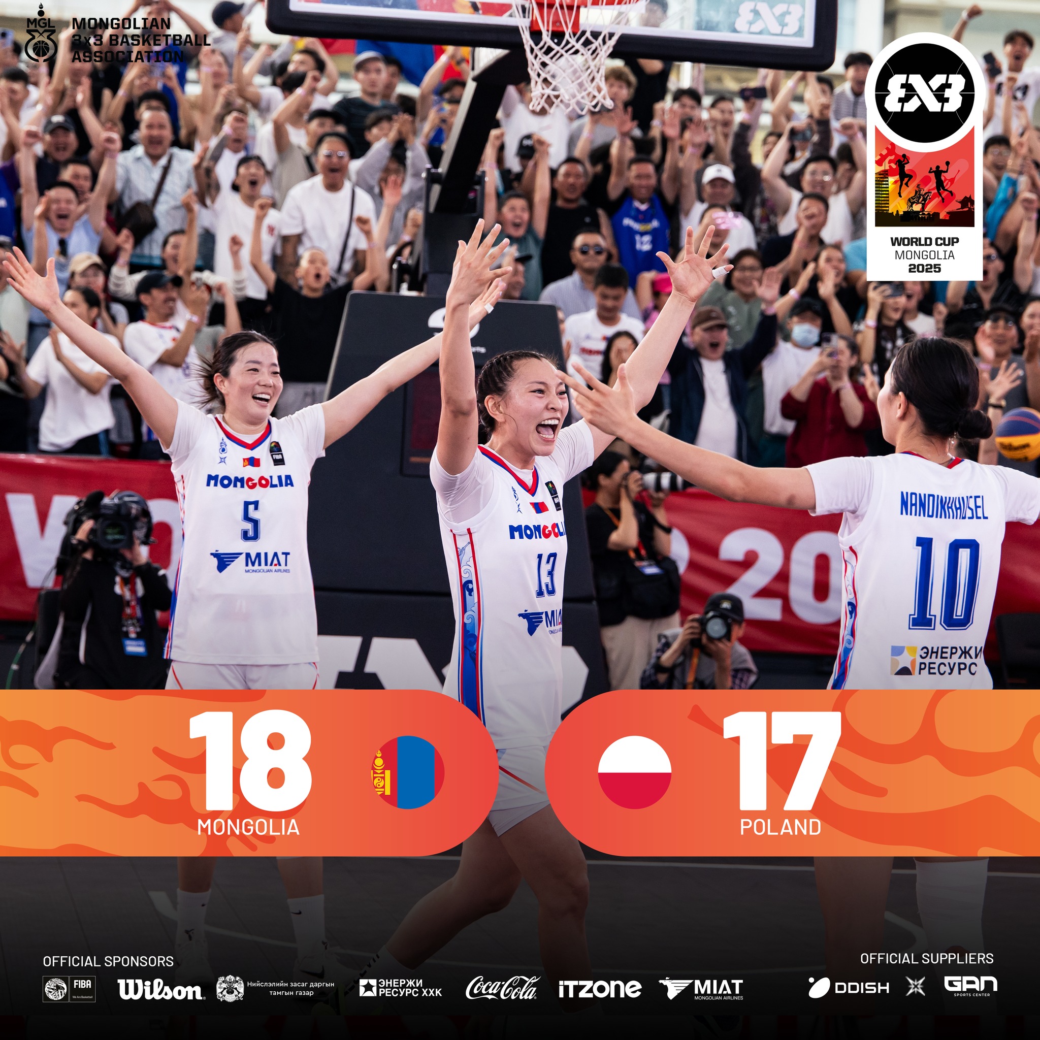 Үүний дараагаар алтан медалийн төлөөх тоглолтыг Нидерланд улсын багтай өрсөлдөн 9:15 оноогоор хожигдсоноор мөнгөн медалийн эзэд боллоо. Энэ бол түүхэн мөч гэдгийг онцлох хэрэгтэй юм. Учир манай улсын шигшээ баг анх удаагаа “Дэлхийн аварга 3х3” тэмцээнээс медаль хүртэж чадлаа.