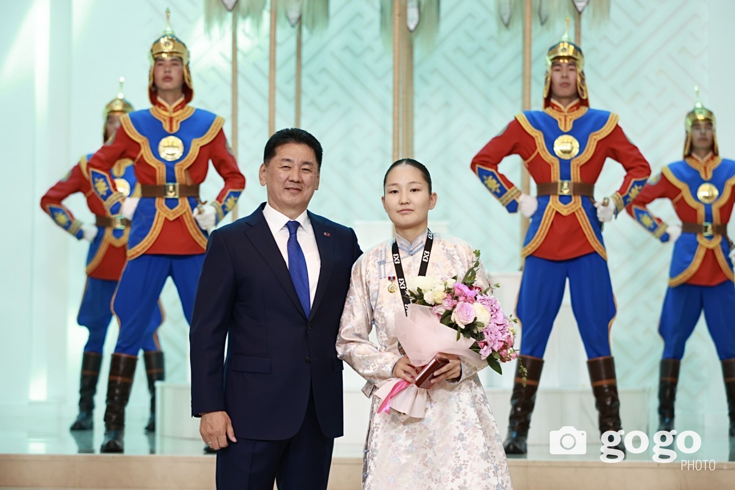Монгол Улсын Ерөнхийлөгч У.Хүрэлсүх Төрийн ордонд шагналыг гардуулж байна.
