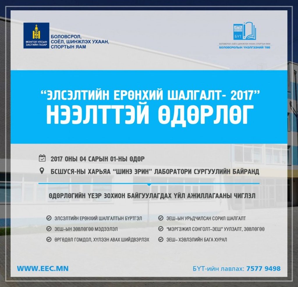 Боловсролын үнэлгээний төвөөс зохион байгуулах "ЭЛСЭЛТИЙН ЕРӨНХИЙ ШАЛГАЛТ-2017" нээлттэй өдөрлөг МАРГААШ буюу 2017 оны дөрөвдүгээр сарын 1-ны өдөр болно.