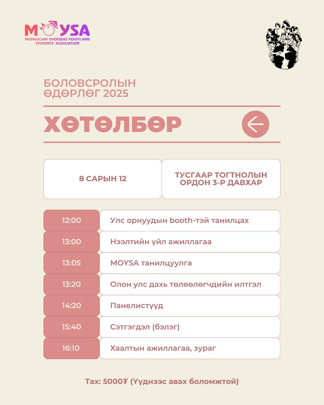 Наймдугаар сарын 12-нд Тусгаар тогтнолын ордонд 12:00–17:00 цагт болох энэ арга хэмжээнд дэлхийн 10 орны Монгол оюутан залуучуудын төлөөлөл цуглаж, гадаадад суралцах боломж, тэтгэлэгт хамрагдах арга зам, амьдрах орчны талаар бодит туршлагаа хуваалцана.