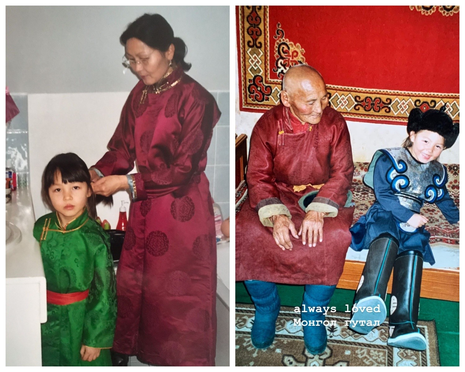 Харин монгол хүмүүс бүлээрээ, эмээ өвөөтэйгөө нэг гэрт амьдарч соёл заншлаа уламжилдгийг би анзаарсан. Эмээ бид хоёр нэг өрөөнд унтаж, дандаа ярилцдаг байв. Эмээ миний хажууд байсан учраас би өвөг дээдэстэйгээ яс үндсээрээ нягт холбогдсон, тэднийхээ үргэлжлэл гэдгээ мэдэрч өссөн.