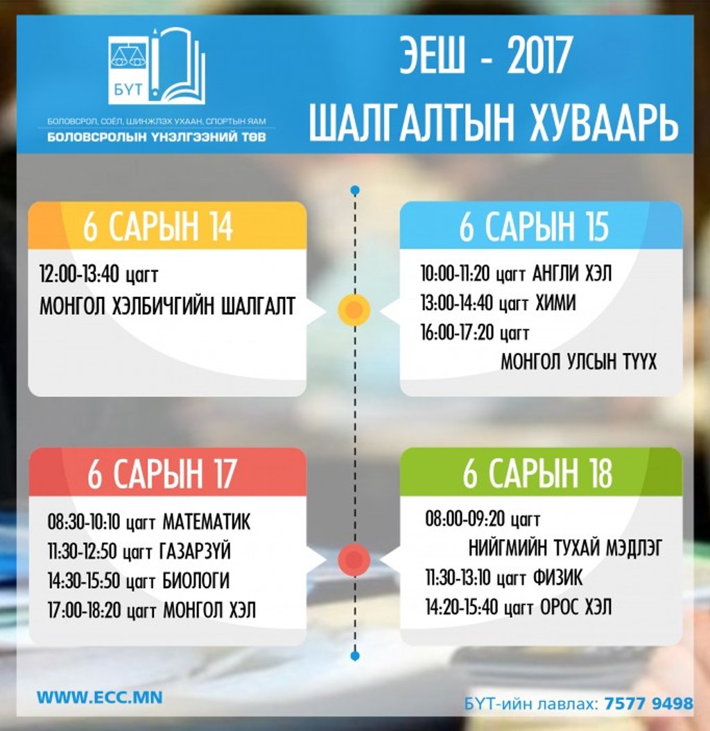 Шалгуулагчид шалгалт өгөх ЭЕШ-ын байр, анги танхим, суудлын хуваарийг баталгаажуулсан хуудсыг өөрийн бүртгэлийн дугаар болон нууц үгийг ашиглан 2017 оны тавдугаар сарын 15-аас хойш www.eec.mn сайтаас хэвлэн авна.