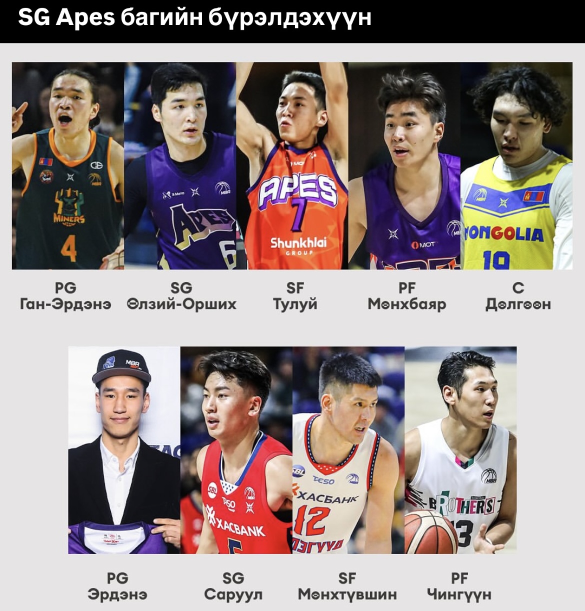 Д.Мөнхтүвшин: Үндэсний дээд лигийн 3 удаагийн аварга, Хасын Хүлэгүүд багийн тоглогч тэрээр SG Apes багтай мөн л 2 жилийн гэрээ байгуулав. 2015 оны MVP тоглогчоос эхлээд олон жилийн туршлагатай тоглогч билээ.