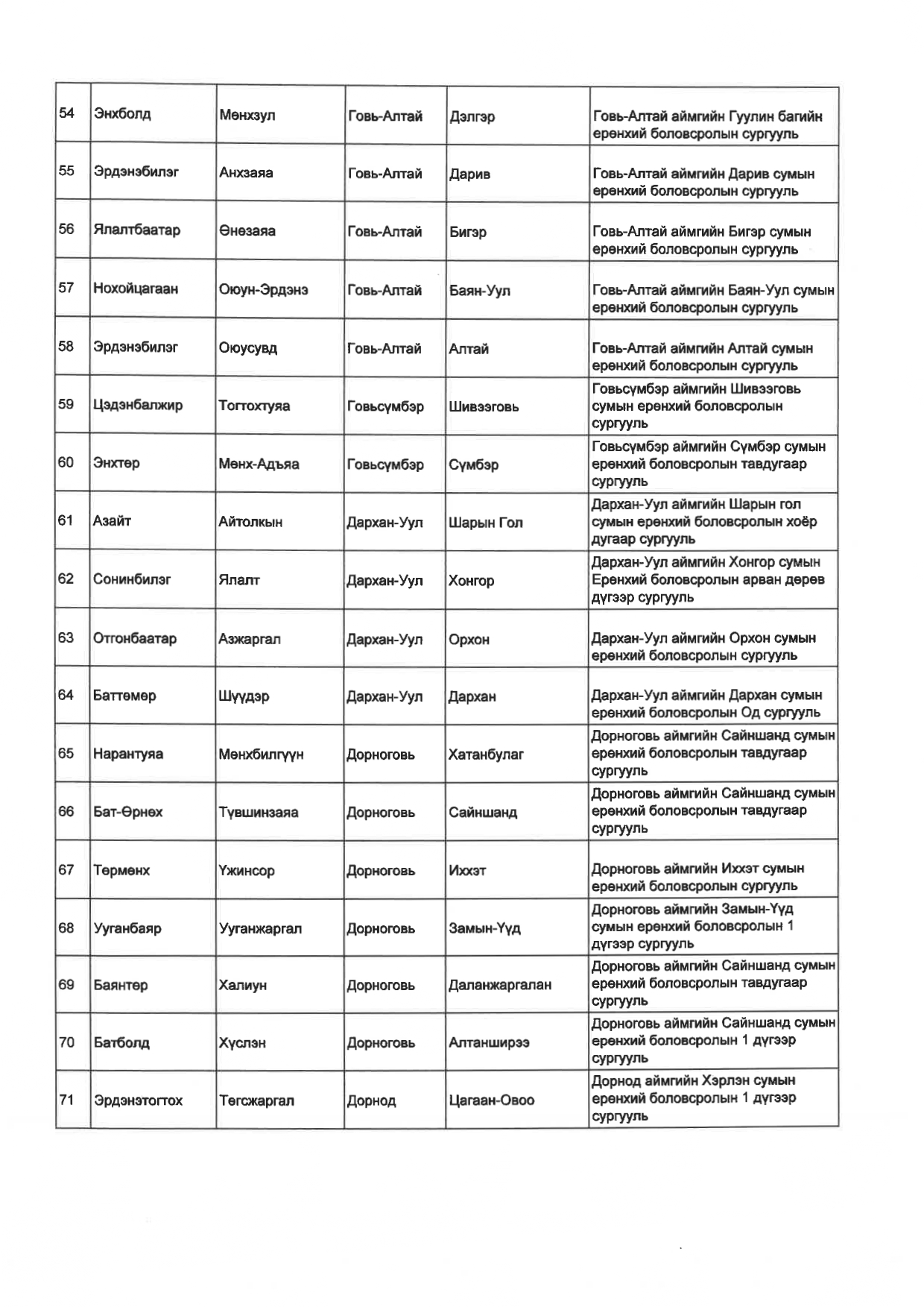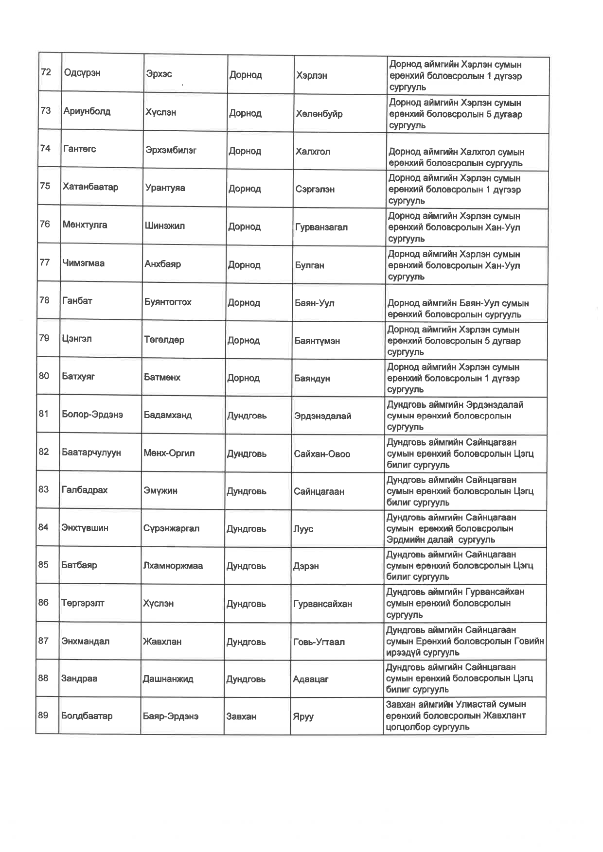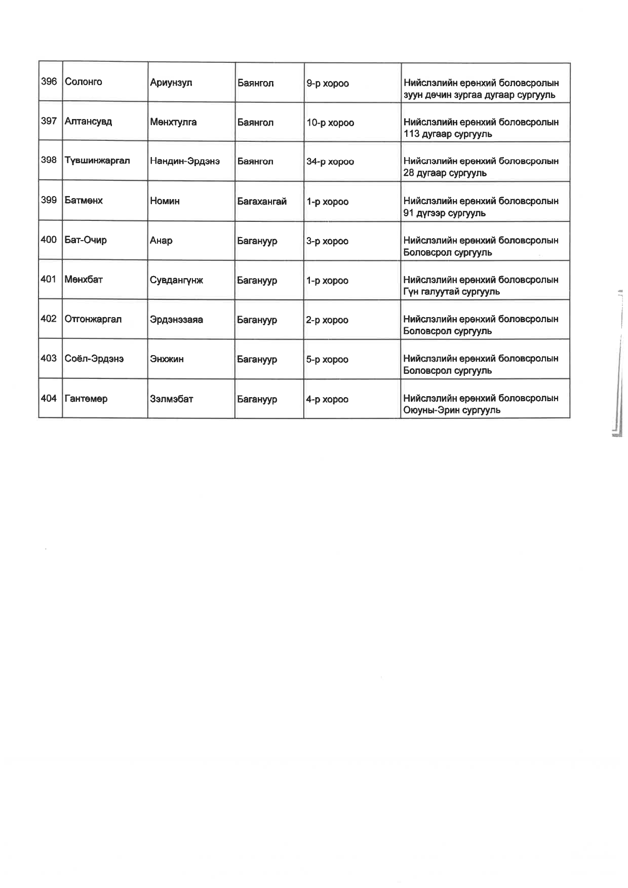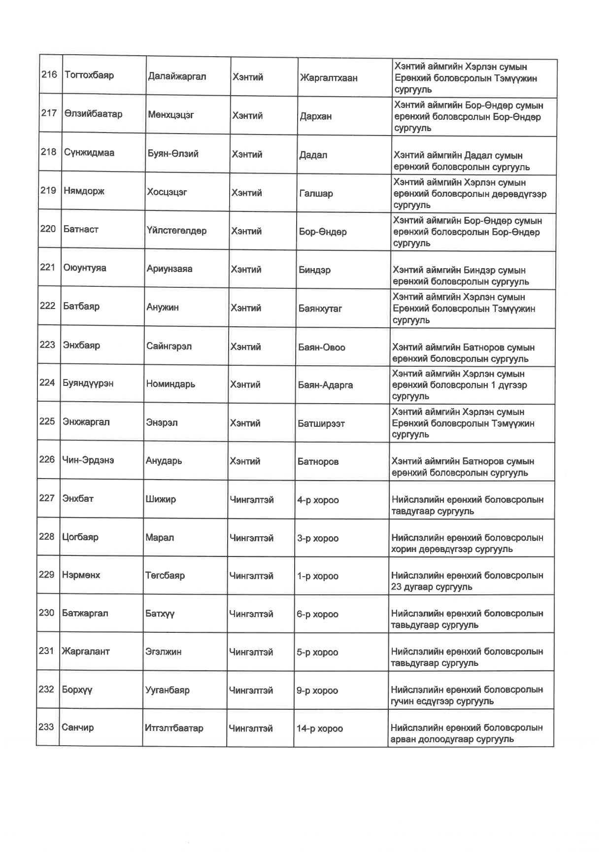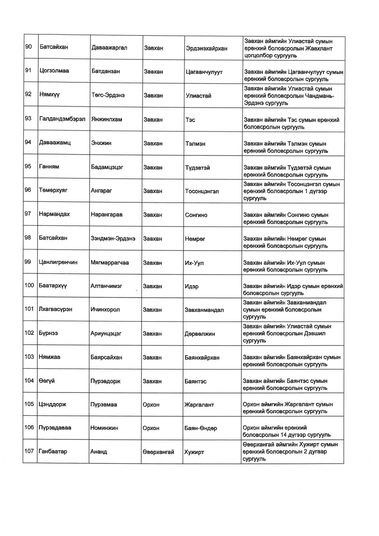 Автоматаар шүүж гаргасан жагсаалтыг Нийслэлийн боловсролын газар, аймгуудын Боловсрол, шинжлэх ухааны газраар баталгаажуулан ирүүлсэн Боловсролын яамны 1/3817 тоот албан бичгийг үндэслэн 404 хүүхдийн нэрийг зарлаж байна.