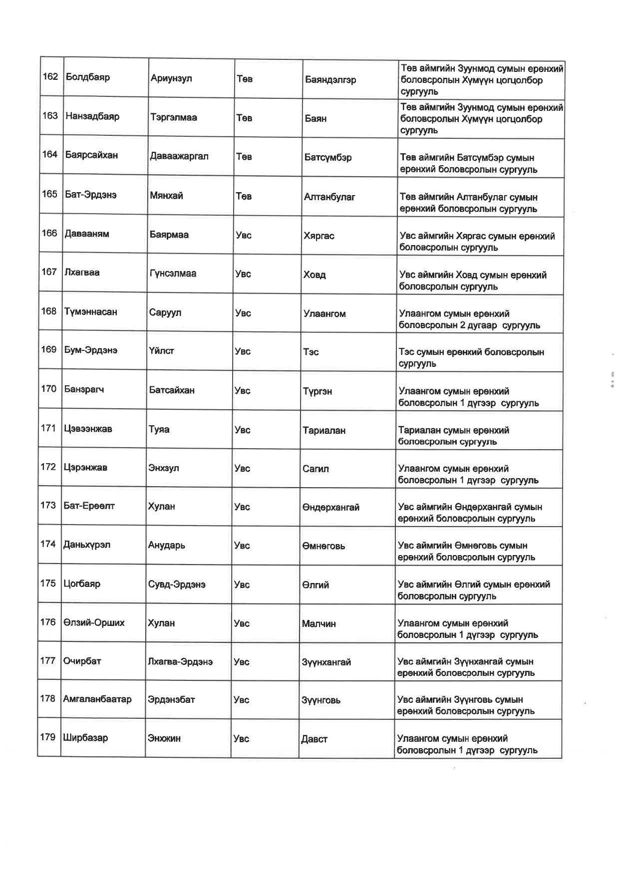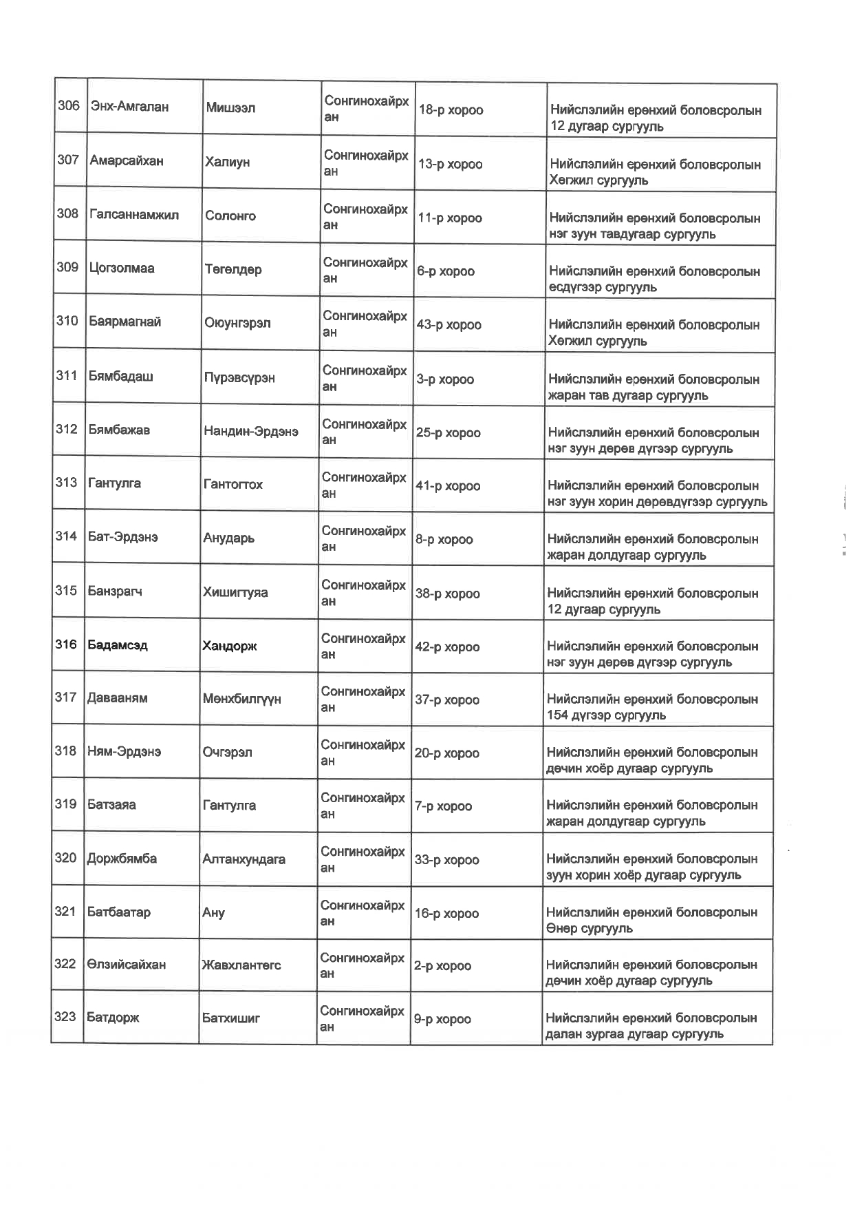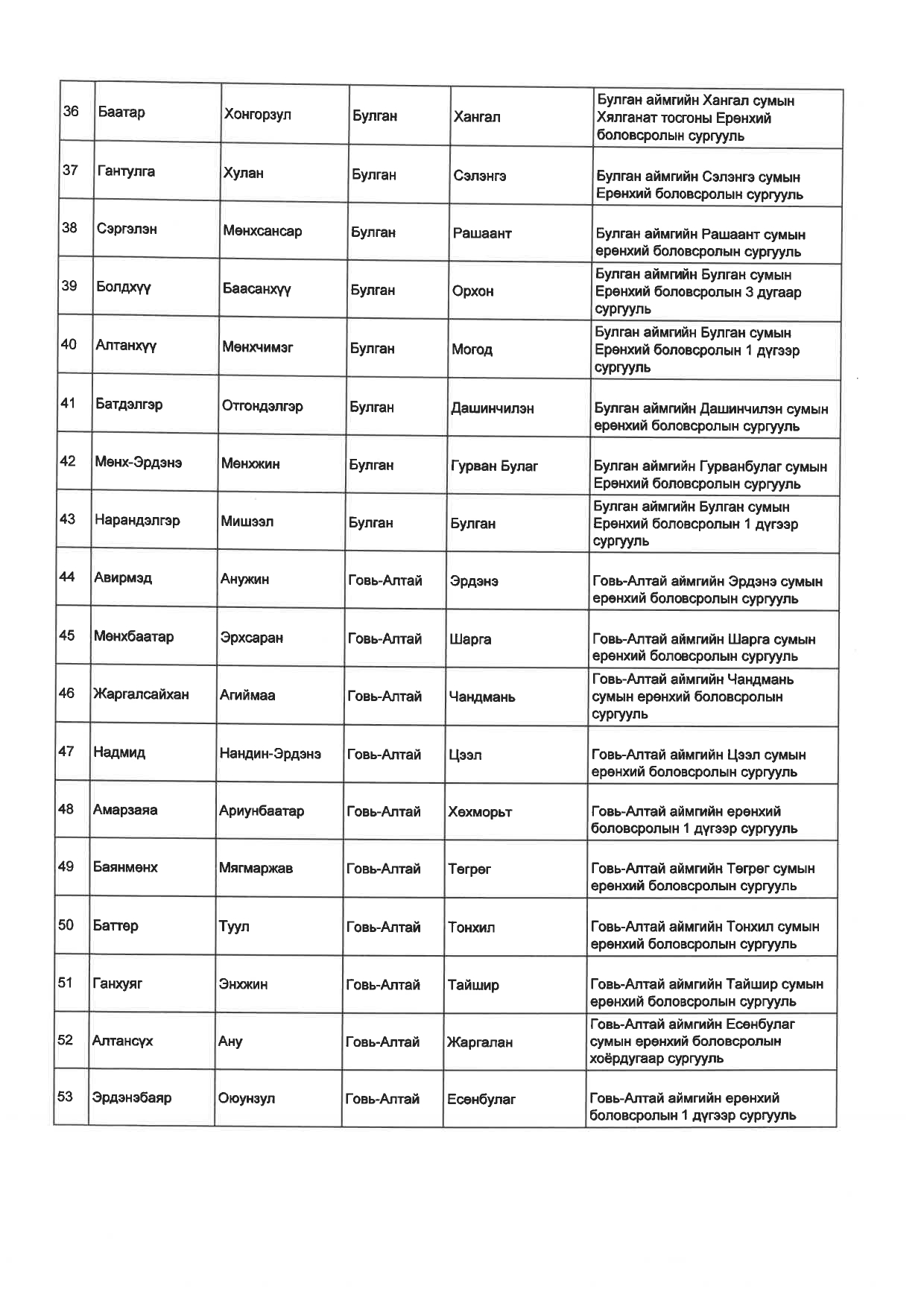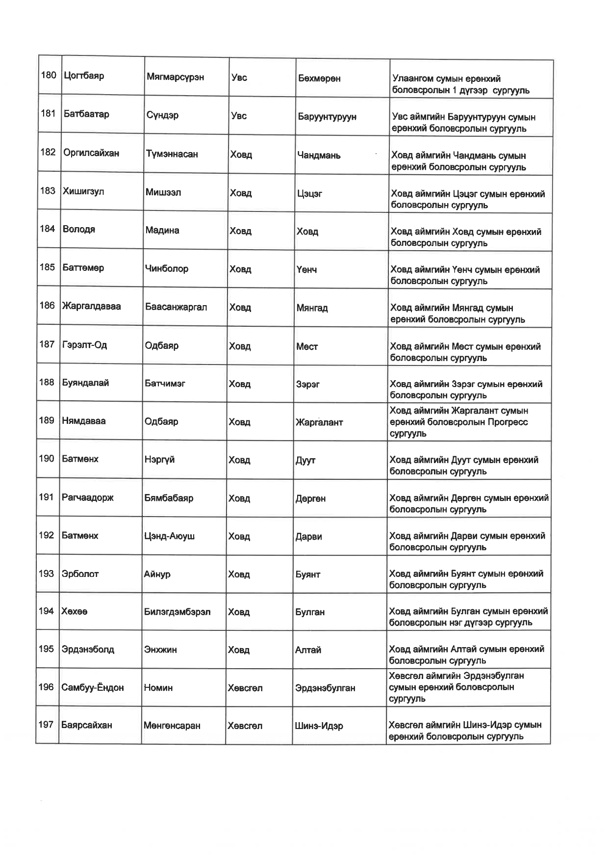 Автоматаар шүүж гаргасан жагсаалтыг Нийслэлийн боловсролын газар, аймгуудын Боловсрол, шинжлэх ухааны газраар баталгаажуулан ирүүлсэн Боловсролын яамны 1/3817 тоот албан бичгийг үндэслэн 404 хүүхдийн нэрийг зарлаж байна.
