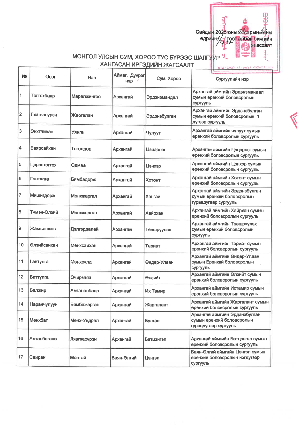 Монгол Улсын 330 сум, нийслэлийн хороо бүрээс нэг шилдэг төгсөгчийг шалгаруулж, дэлхийн нэр хүнд бүхий их, дээд сургуульд суралцуулах “Ерөнхийлөгчийн илгээлт-2100” тэтгэлэгт хөтөлбөрийн 2025 оны бэлтгэл хөтөлбөрийн эхний шатанд шалгарсан хүүхдүүдийн нэрс тодорлоо.
