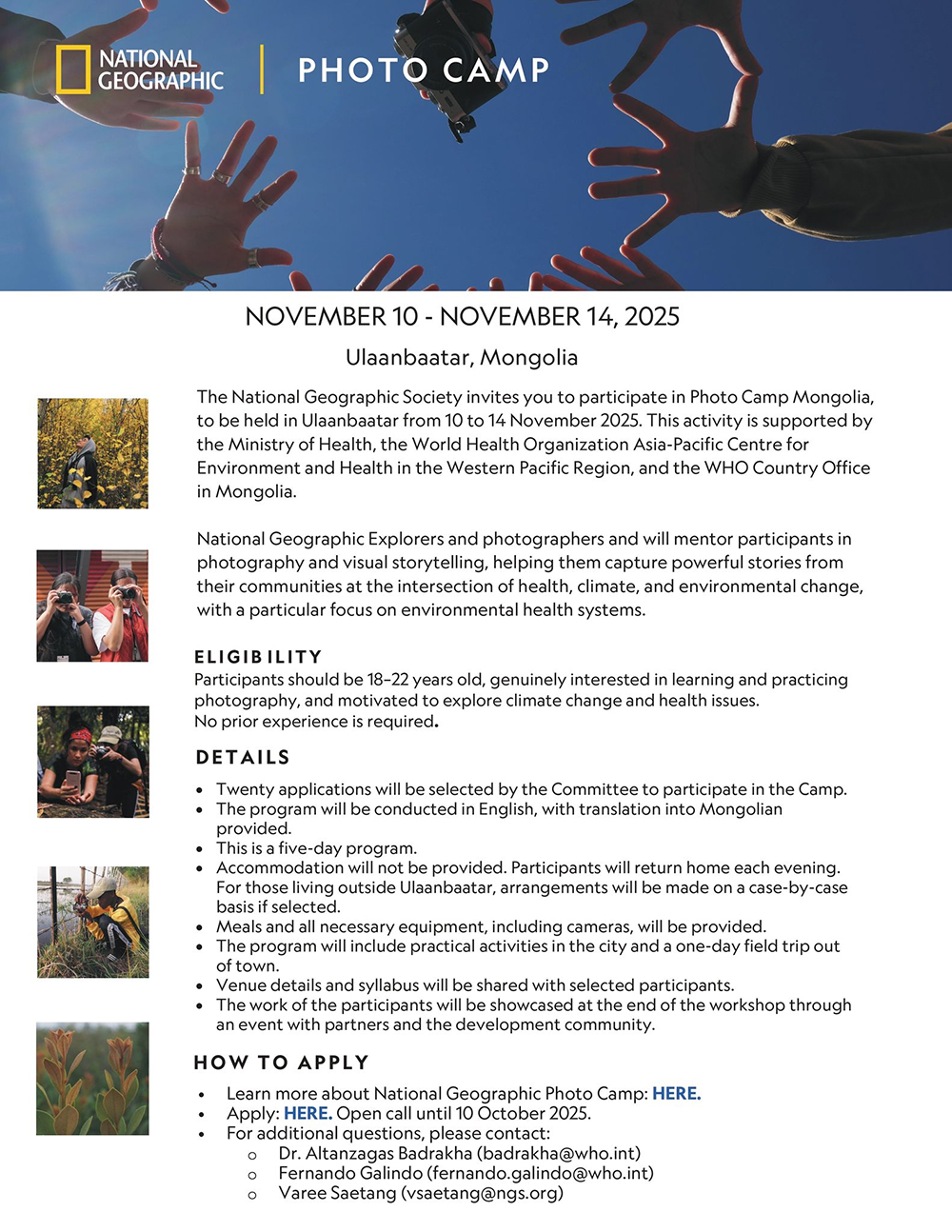 Үндэсний Газарзүйн Нийгэмлэг 2025 оны 11 дугээр сарын 10-наас 11 дугээр сарын 14-ний хооронд Улаанбаатар хотноо зохион байгуулагдах Монгол дахь гэрэл зургийн кэмп арга хэмжээнд таныг оролцохыг урьж байна.