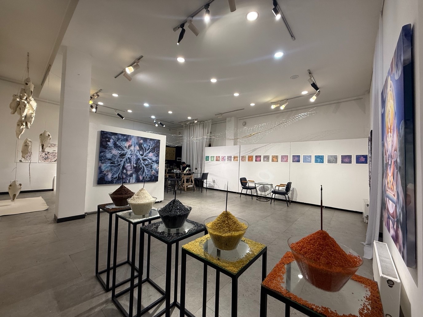 Үзэсгэлэнгийн хоёр танхимыг гэгээлэг ба бараан орчноор шийдсэн нь сонирхол татахаас гадна, орон зайг бүтээлүүддээ уялдуулжээ. Баруун гарын дүрмээр гэрэлтүүлэгтэй танхим руу ороход өрөг урлагийн бүтээлүүд хана таазнаас өлгөсөн нь сонирхол татна.