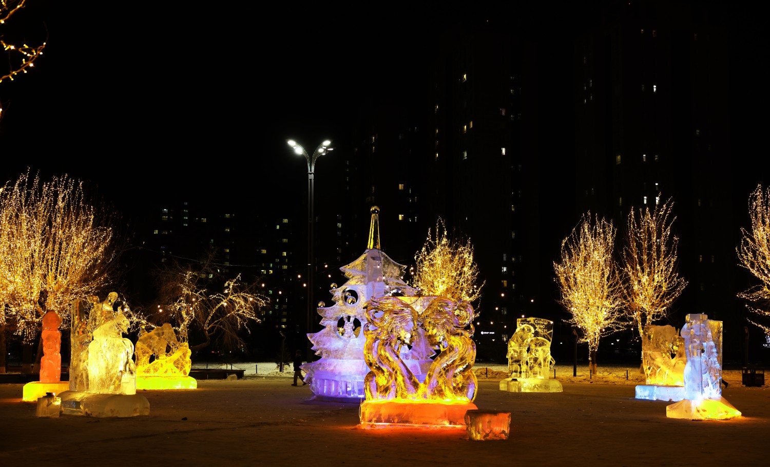 Төв цэнгэлдэх хүрээлэнгийн баруун талд хүүхэд залуус, иргэд чөлөөт цагаа өнгөрүүлэх боломжтой мөсөн гулгуур, тэшүүрийн талбай, амьтдын баримал, сүлд мод, гэрэлтүүлэг, чимэглэл бүхий мөсөн хотхон урлажээ.