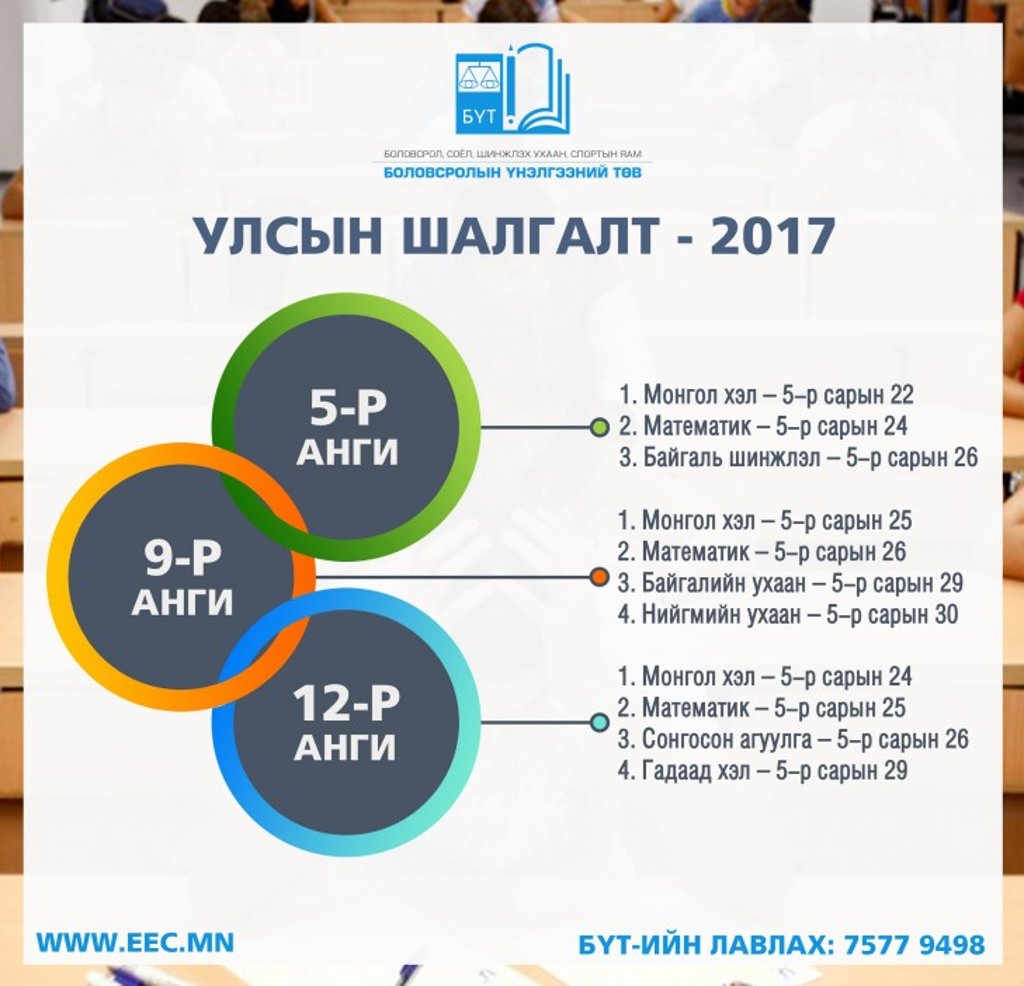 Улсын шалгалтыг 2017 оны хичээлийн жилд үйл ажиллагаа явуулж буй ерөнхий боловсролын сургуулийн 5, 9, 12-р ангийн төгсөгчдөөс авна. Та дараах холбоосоор дамжуулан улсын шалгалтын жишиг даалгавартай ЭНД дарж танилцаарай.