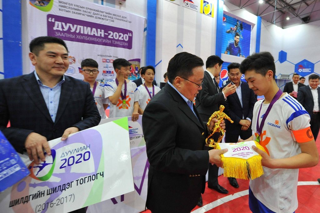 “Дуулиан-2020” заалны хөлбөмбөгийн тэмцээний нас, насны ангиллын шагналт байранд орсон баг тамирчдыг танилцуулж байна.