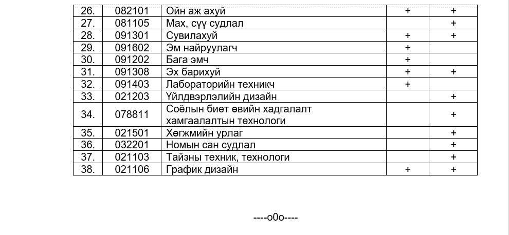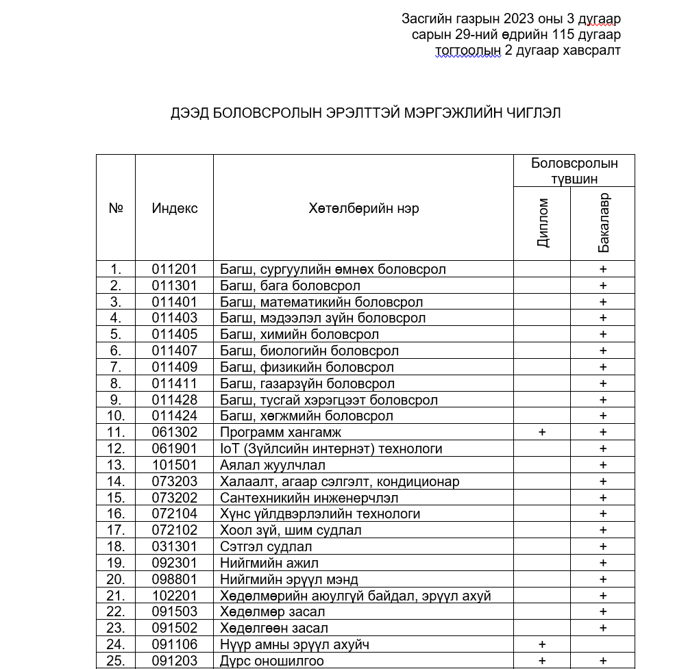 Манай улсад 2023 онд баталсан хамгийн их эрэлттэй байгаа 38 мэргэжлийн жагсаалтыг хүргэе. Өмнө нь тэргүүлэх 83 мэргэжлийг танилцуулсан билээ.