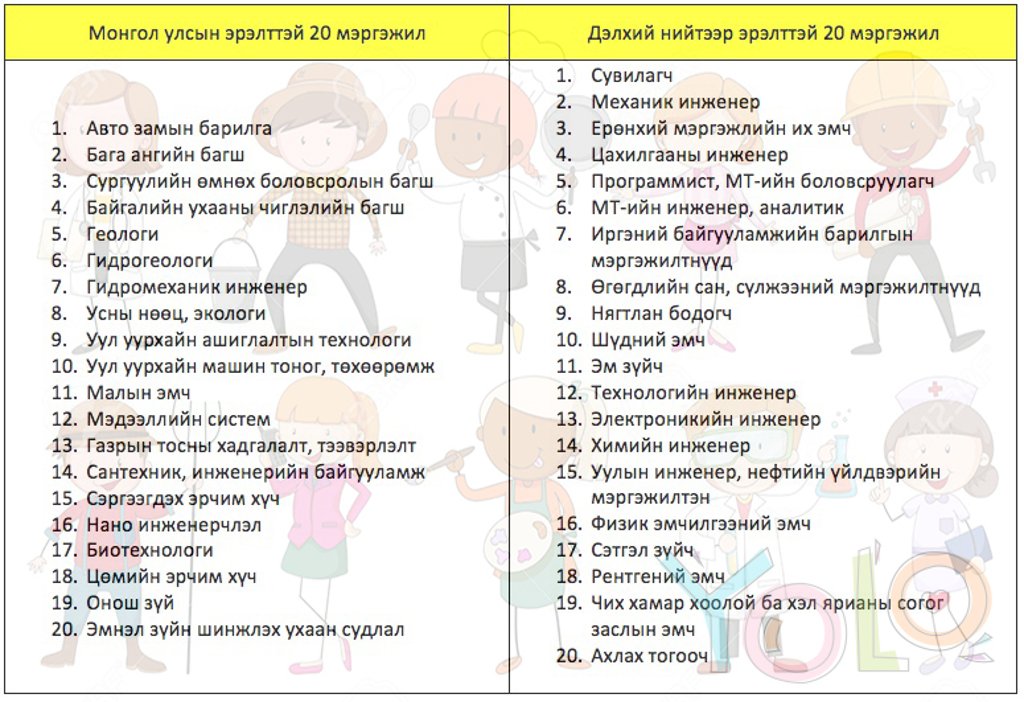 Монгол улсад болон дэлхий нийтээр эрэлттэй байгаа 20 мэргэжлүүдийг танилцуулж байна.
