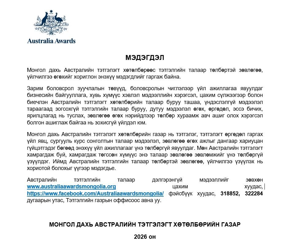 Монгол Улсын иргэдэд Австралийн их сургуулиудад бакалаврын дараах зэрэгт суралцах боломжийг олгодог Австралийн тэтгэлэгт хөтөлбөр зарлагдсан.
