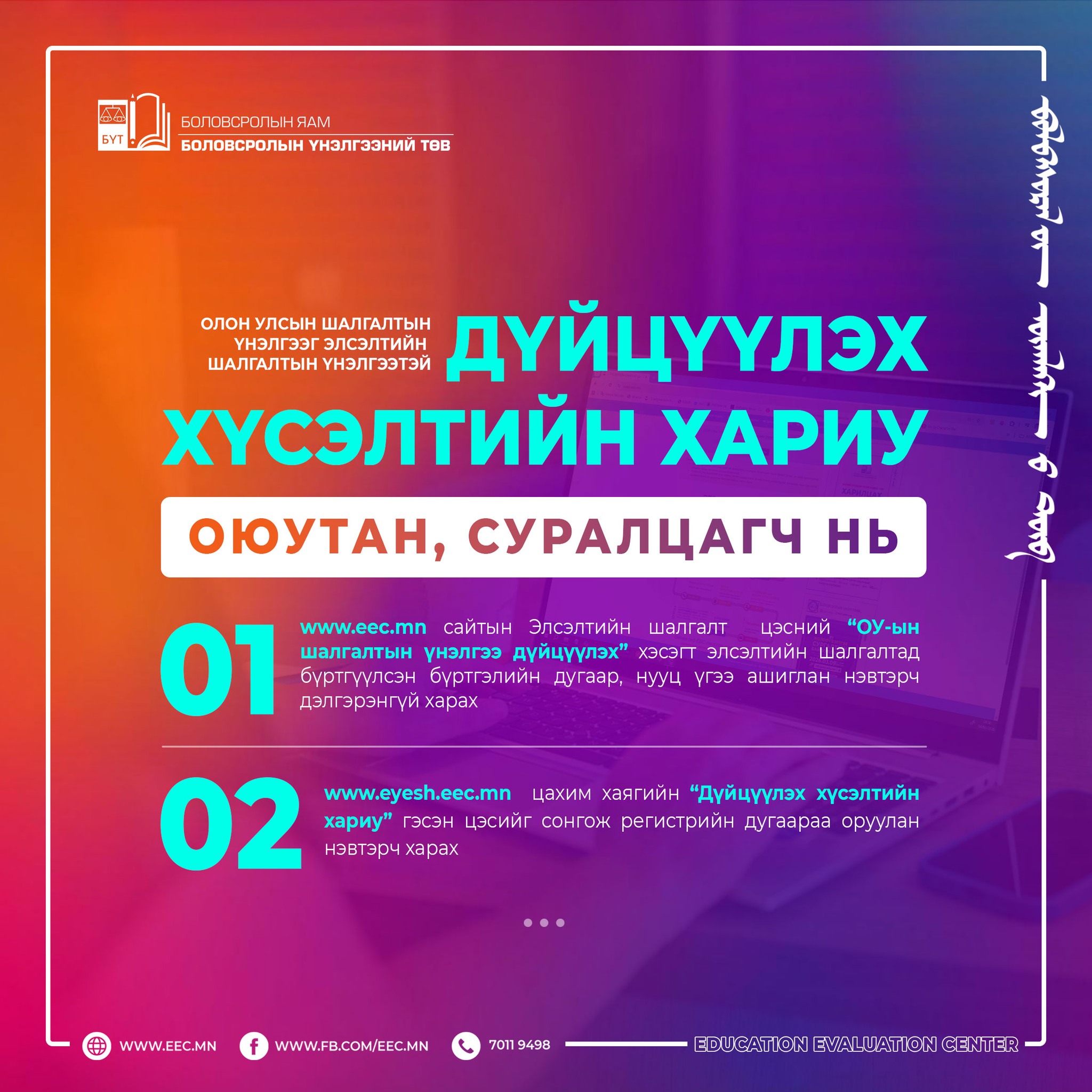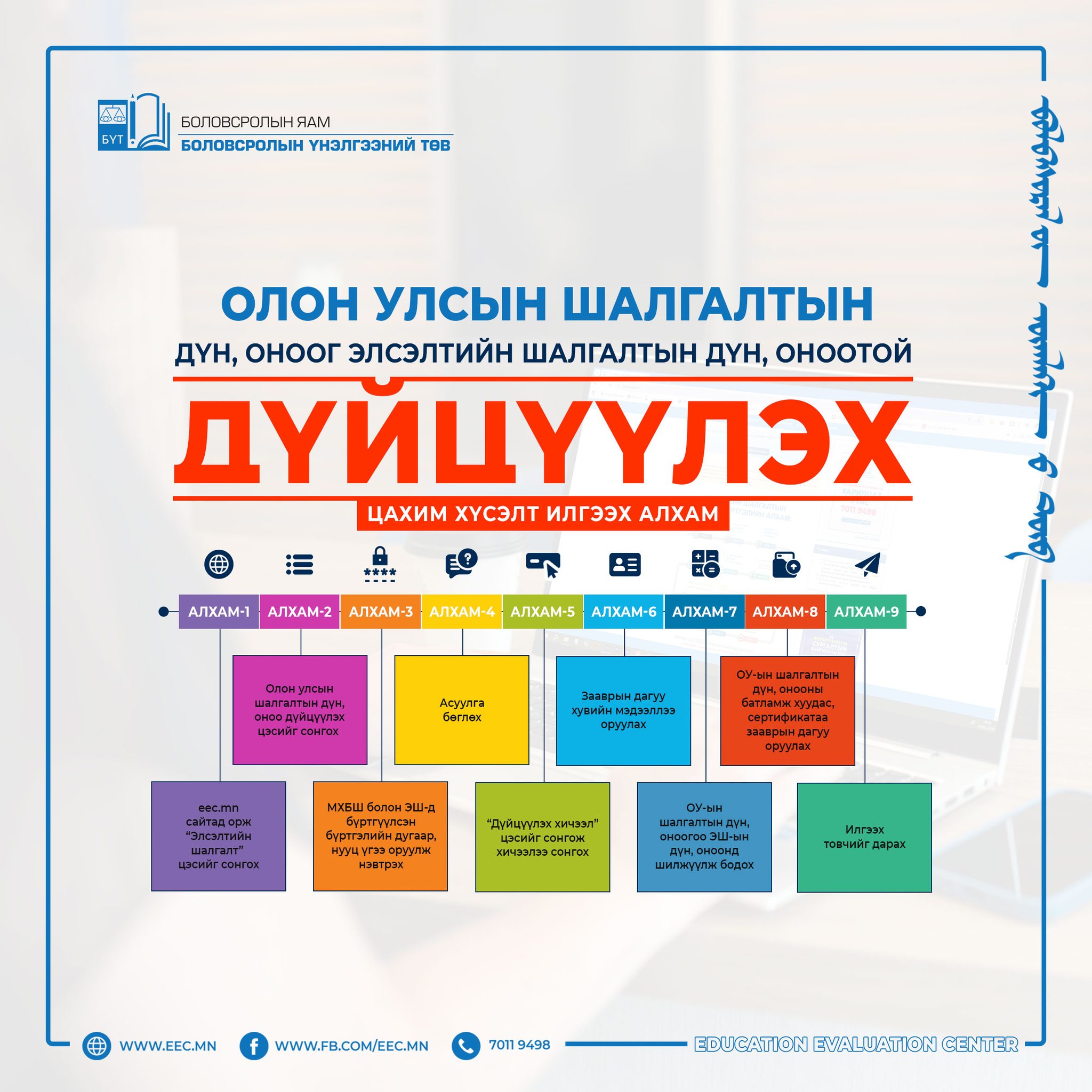 Олон улсын шалгалтын үнэлгээг Монгол улсын ЭШ-ын үнэлгээнд дүйцүүлэх хүсэлт, холбогдох бичиг баримтыг тухайн жилийн ЭШ эхлэхээс хамгийн багадаа ажлын 15 хоногийн өмнө Боловсролын үнэлгээний төвийн www.eec.mn сайтад орж “Элсэлтийн шалгалт” гэсэн цэсийг дарж “ОЛОН УЛСЫН ҮНЭЛГЭЭ ДҮЙЦҮҮЛЭХ” гэсэн сонголтыг хийж, ЭШ-д бүртгүүлсэн бүртгэлийн дугаар, нууц үгээ ашиглан системд нэвтэрч холбогдох мэдээлэл болон материалаа зааврын дагуу оруулан хүсэлтээ цахимаар ирүүлнэ.