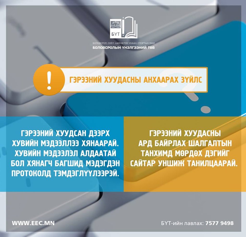 Шалгуулагчдыг суудлын хуваарийн дагуу байраа эзлэхэд таны хувийн мэдээлэл бүхий гэрээний хуудсыг ширээн дээр бэлтгэн тавьсан байх бөгөөд хувийн мэдээллийн үнэн зөв эсэхийг сайтар нягтлан, арын нүүрэнд байгаа шалгалтын үед баримтлах зарчим, дэгтэй танилцан гарын үсэг зурж баталгаажуулахыг хянагч багшаас анхааруулна.