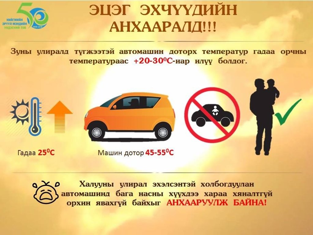 Жишээлбэл, гадаа +25 градус байхад түгжээтэй автомашин дотор 45-55 градус хүрдэг тул бага насны хүүхдийг автомашиндаа үлдээхгүй байхыг анхааруулж байна.