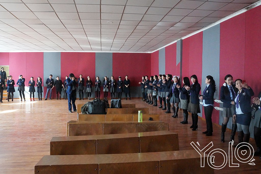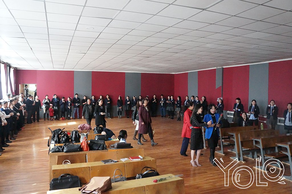 Багш нарыгаа угтан баяр хүргэх гэж сургуулийн үүднээс шат хүртэл урт эгнээ болон догдлон зогсож буй ахлах ангийнхан. Тэдний хувьд ЕБС-ийн сүүлийн жил.