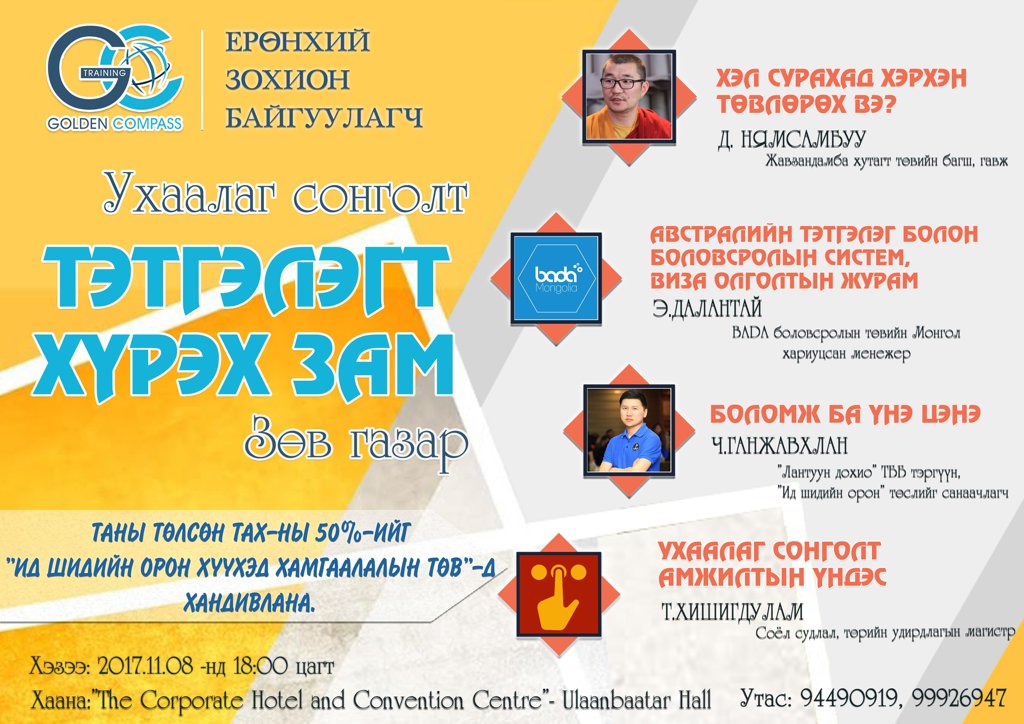 Ухаалаг Сонголт: Тэтгэлэгт хүрэх зам, Зөв газар өдөрлөг 11-р сарын 8-ны 18 цагт Corporate зочид буудлын хурлын зааланд болох гэж байна. Тус өдөрлөгийн ерөнхий зохион байгуулагчаар Golden Compass сургалтын төв ажиллаж байгаа аж.