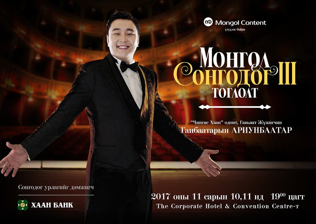 Дэлгэрэнгүй: МУГЖ дуучин Г.Ариунбаатарын "МОНГОЛ СОНГОДОГ 3" тоглолт бөгөөд ерөнхий зохион байгуулагчаар "Монгол Мюзик" төслийг хэрэгжүүлж буй "Монгол контент" ХХК ажиллаж байна.