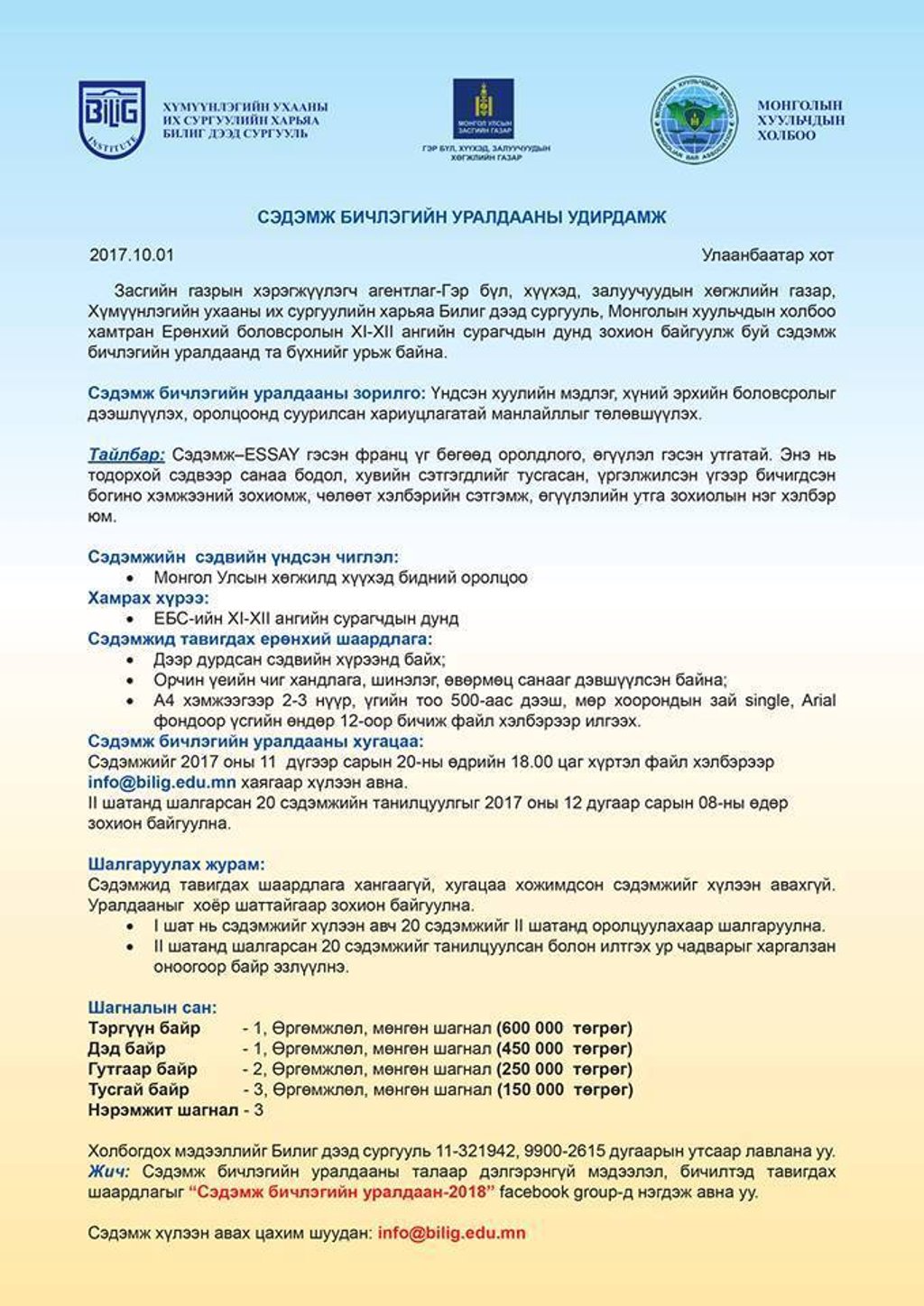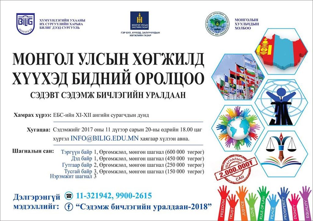 -Хүмүүнлэгийн ухааны их сургуулийн харьяа Билиг дээд сургууль, Монгол Улсын Засгийн газрын хэрэгжүүлэгч агентлаг Гэр бүл, хүүхэд, залуучуудын хөгжлийн газар болон Монголын хуульчдын холбоо хамтран ЕБС-ийн XI-XII ангийн сурагчдын дунд "Монгол Улсын хөгжилд хүүхэд бидний оролцоо" сэдэвт сэдэмж бичлэгийн уралдааныг хоёр дахь жилдээ зохион байгуулж байна. Одоогийн байдлаар бид 21 аймаг , нийслэлийн есөн дүүргийн ЕБС-иудад сэдэмж бичлэгийн уралдааны удирдамжийг хүргүүлээд байна.