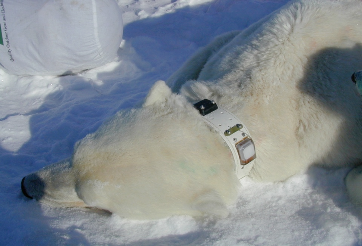 Мөн цагаан баавгайн хүзүүнд "байршил тогтоогч" маягийн төхөөрөмж суулгасан. Гэхдээ дан ганц байршил тогтоох биш толгойноос хөлийн ул хүртэл биеийн бүх хэсгийн мэдээллийг дамжуулах төхөөрөмж юм.
