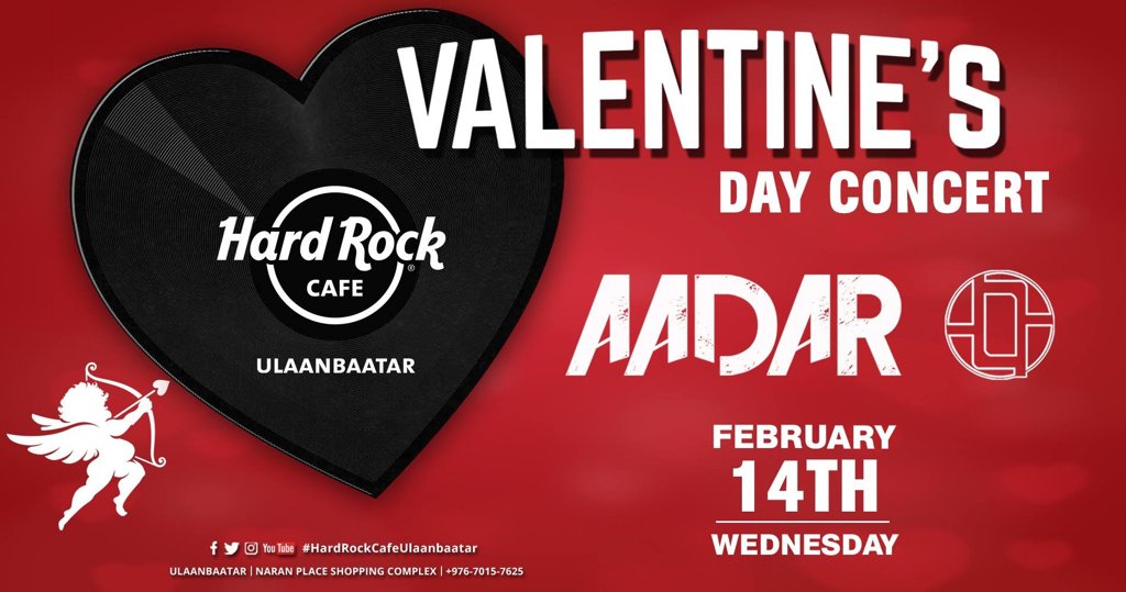 Аадар хамтлаг энэ гэгээн Валентины өдөр Hard Rock Cafe Ulaanbaatar-т өөрсдийн болон бидний сайн мэдэх хамгийн романтик дуунуудыг толилуулах гэж байна! Дотнын нэгэнтэйгээ эсвэл найз нөхдөөрөө нэгэн үдшийг мартагдашгүй өнгөрөөцгөөе.