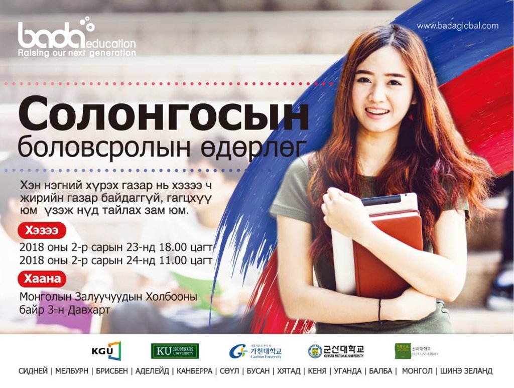 Дэлгэрэнгүй: Солонгос улсын их дээд сургуулиудад суралцах сонирхолтой залуус та бүхнийг манай төвөөс зохион байгуулж буй дараах өдөрлөгт урьж байна. Өдөрлөгт хүрэлцэн ирснээр Солонгосын их дээд сургуулиудын талаарх зөвлөгөө, тэдгээрийн давуу талууд болон Солонгосын элчинд бүрдүүлэх материал, түүний хамгийн чухал хэсэг болох санхүүгийн баталгаа хэрхэн харуулах гээд хэрэгтэй бүхий л мэдээллээ нэг дороос авах боломжтой.